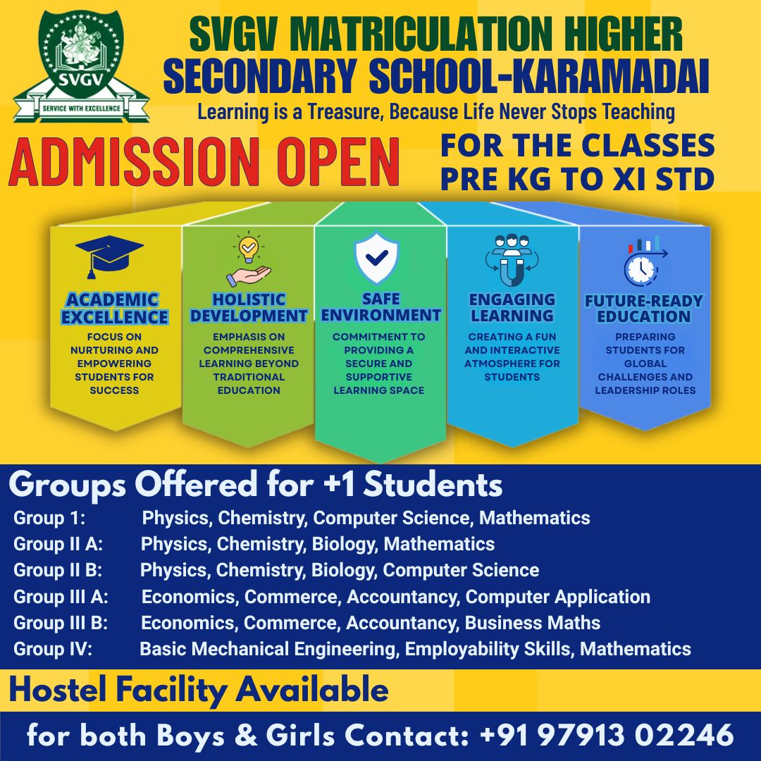 SVGV Matriculation Higher Secondary School provides a seamless educational journey from kindergarten to Higher Secondary, offering a comprehensive and developmentally appropriate curriculum at every stage. SVGV Matriculation Higher Secondary School prepares students for academic excellence, college readiness, and future career pathways through advanced coursework, personalized guidance, and a supportive learning environment. Our holistic approach ensures that students receive a well-balanced education that fosters intellectual growth, social-emotional well-being, and a passion for lifelong learning.